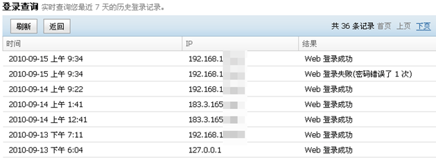 可以。为了保障邮箱的的安全,您可以单击 Webmail 界面左上角的用户自助查询”登录查询”查看。您可以查看七天内登录您邮箱的 IP 地址、具体时间和登录结果。